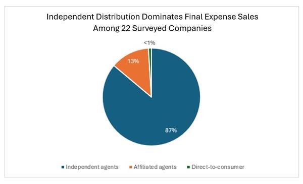 - Independent agents represented the overwhelming majority of final expense premium (87%), among the survey participants. Affiliated agents held 13% of the market share and direct-to-consumer sales represented less than 1% of sales among the responding companies.